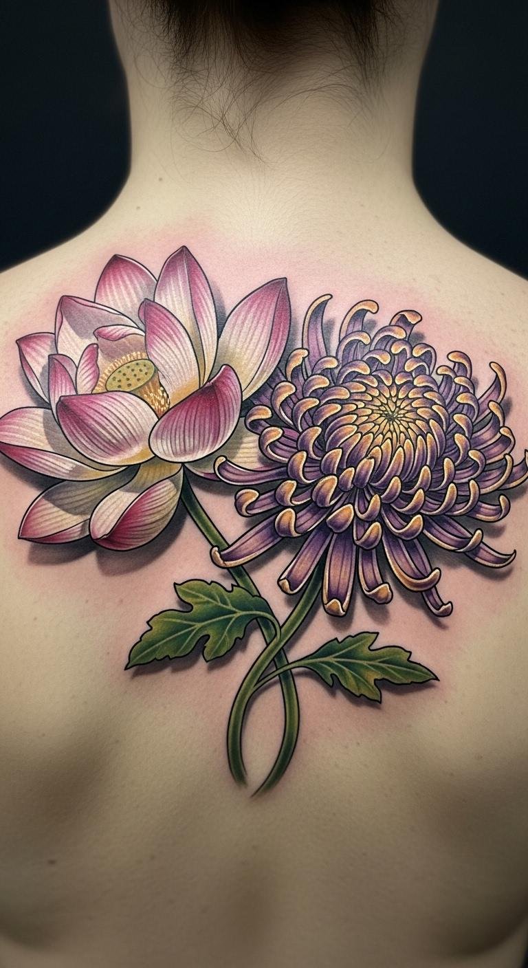 The lotus, often emerging from murky waters, represents the journey of overcoming adversity, while the chrysanthemum signifies a life well-lived, full of grace and endurance.