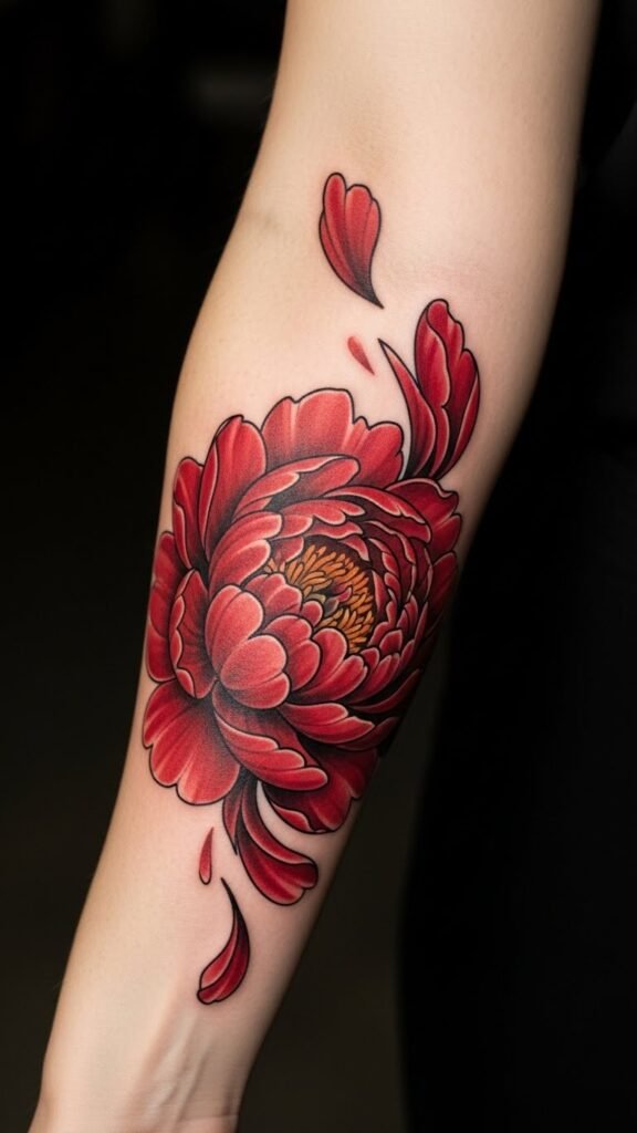 Red peonies burst forth like flames of passion in the domain of tattoo symbolism, embodying a rich tapestry of emotions and meanings.