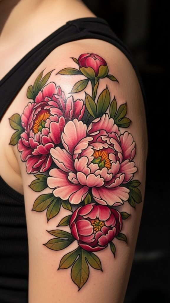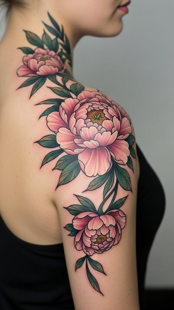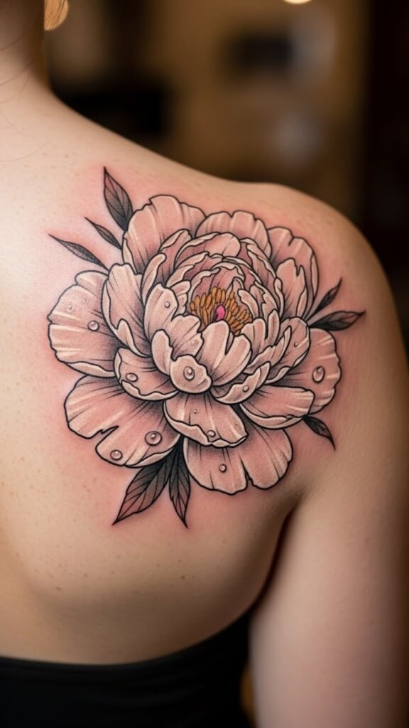 The peony, a symbol of prosperity and elegance, beautifully adorns the shoulder, a place of strength and grace. This placement not only accentuates the body’s natural lines but also conveys resilience and beauty, embodying the spirit of the wearer.