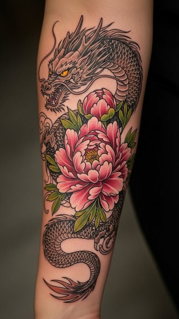 The peony symbolizes beauty and prosperity, reflecting the softer side of life, while the dragon represents strength and power, embodying courage and wisdom.