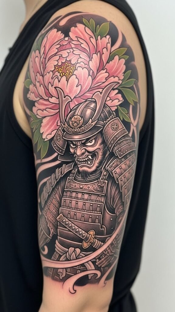 This tattoo embodies the duality of strength and grace, with the samurai symbolizing honor and bravery, while the peony represents resilience and beauty.