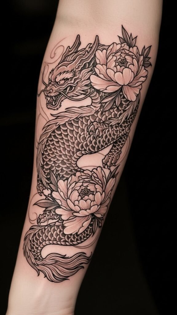 This placement allows for a large canvas, making it visually striking while also representing the wearer’s journey through life. The harmony of the peony’s delicate petals and the koi’s dynamic movement reflects a balance between strength and grace, inviting admiration and personal introspection.