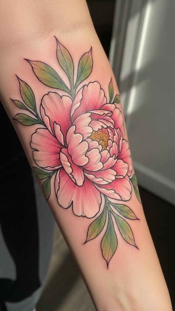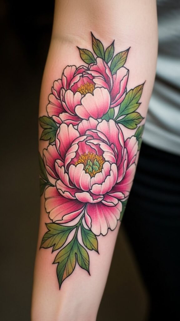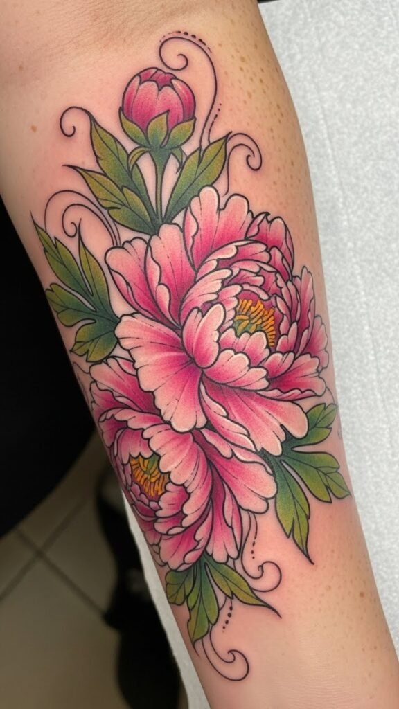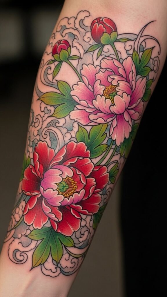 The Japanese peony, often associated with love, prosperity, and resilience, makes for a powerful tattoo design. Placed on the forearm, it becomes a visible reminder of personal growth and strength. The bright colors embody joy and vitality, while the placement allows for easy visibility, inviting admiration and sparking conversations. This tattoo not only enhances the wearer’s style but also serves as a personal emblem of their journey through life, making it a meaningful addition to their body art collection.