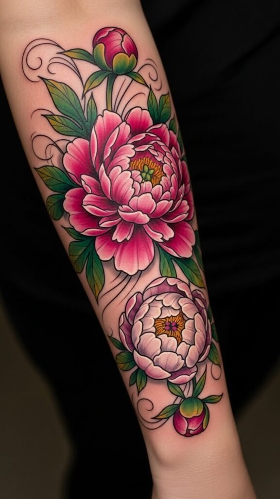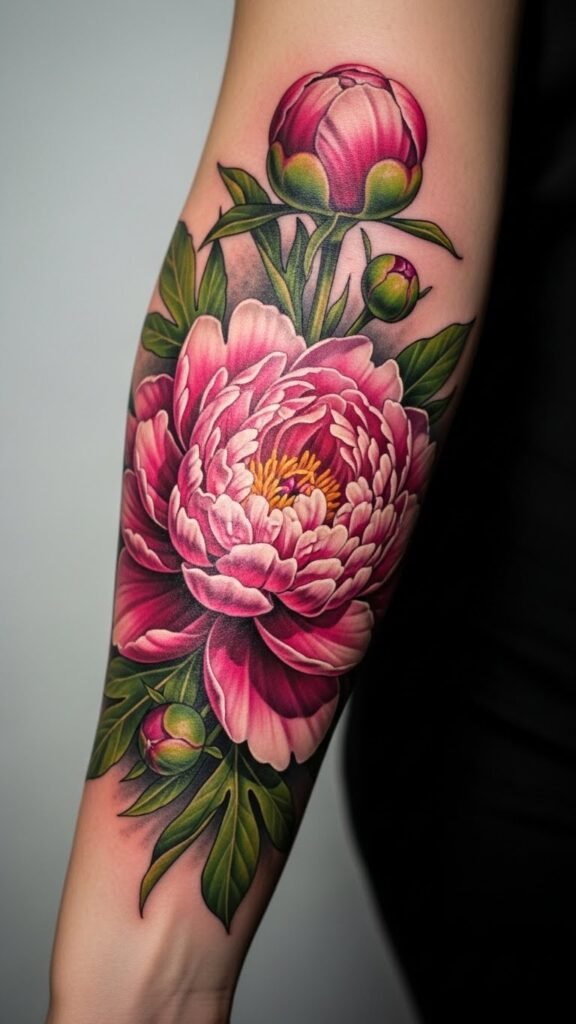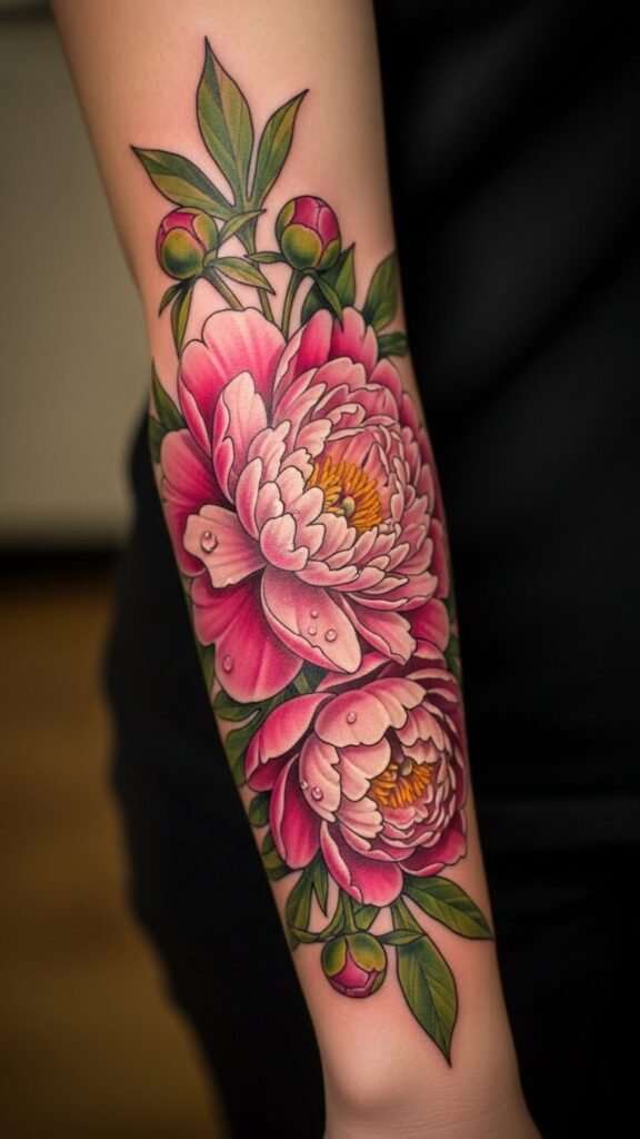 The peony tattoo on the forearm symbolizes beauty, resilience, and growth, making it a powerful emblem of personal identity.