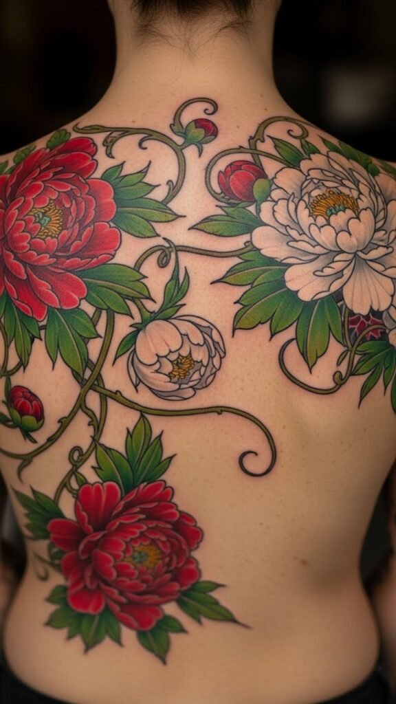 Back Tattoos Featuring Expansive Peony Scenes