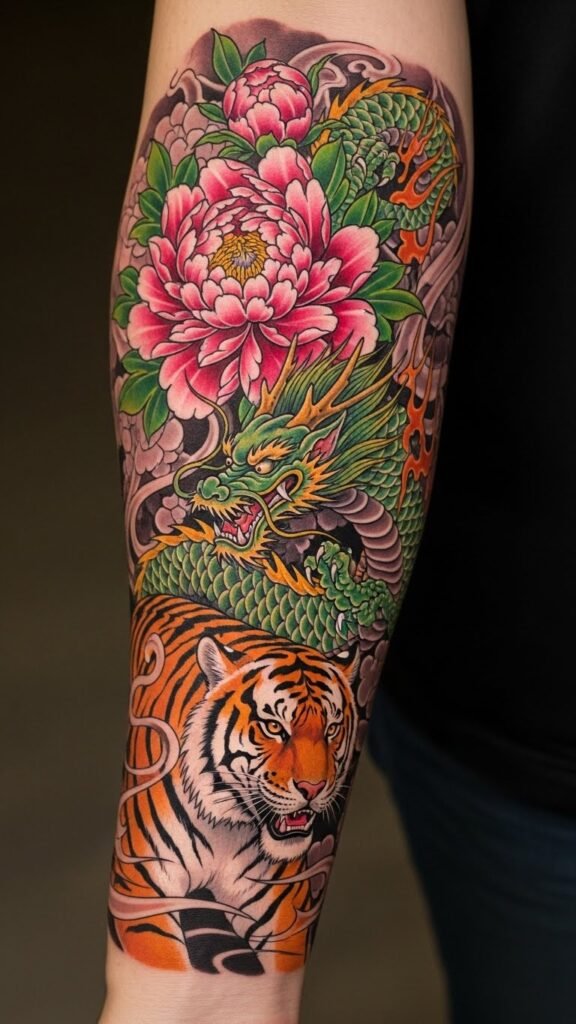 The peony represents prosperity and honor, while the dragon and tiger signify protection and courage.