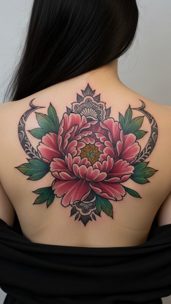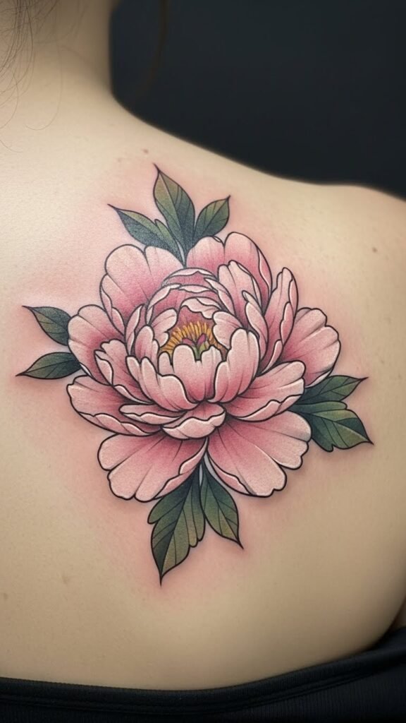 The peony tattoo on the upper back serves as a striking representation of beauty and personal narratives. Its placement on a visible area allows for bold expression, inviting conversations about the wearer’s story.