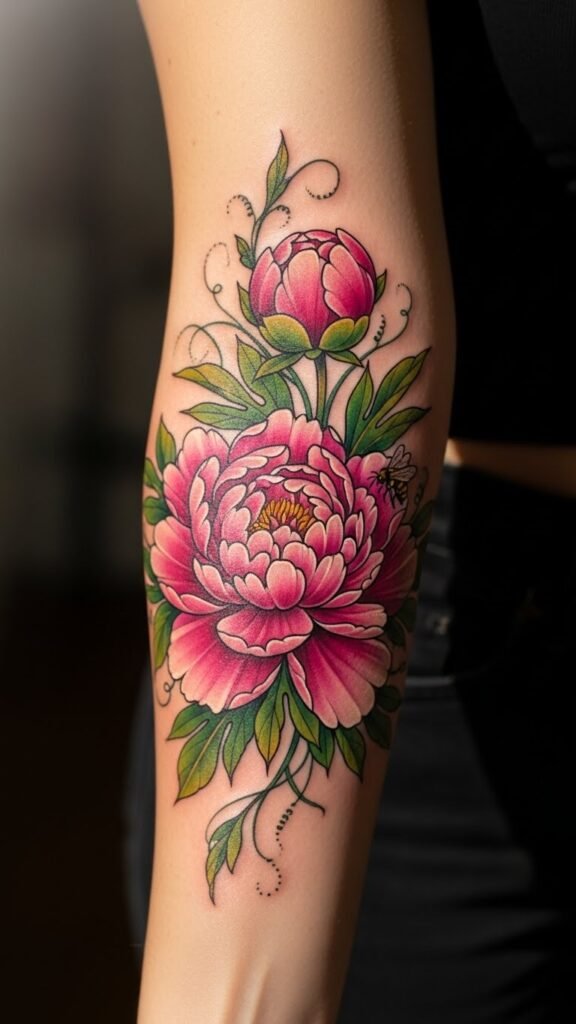 The peony tattoo, placed on the forearm, symbolizes strength and beauty, drawing from its rich cultural heritage.