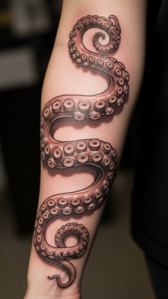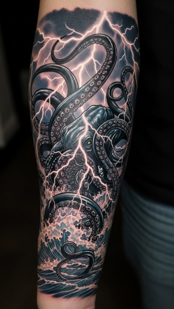This small forearm kraken tattoo encapsulates resilience and adventure, serving as a personal emblem of strength amidst life’s challenges.