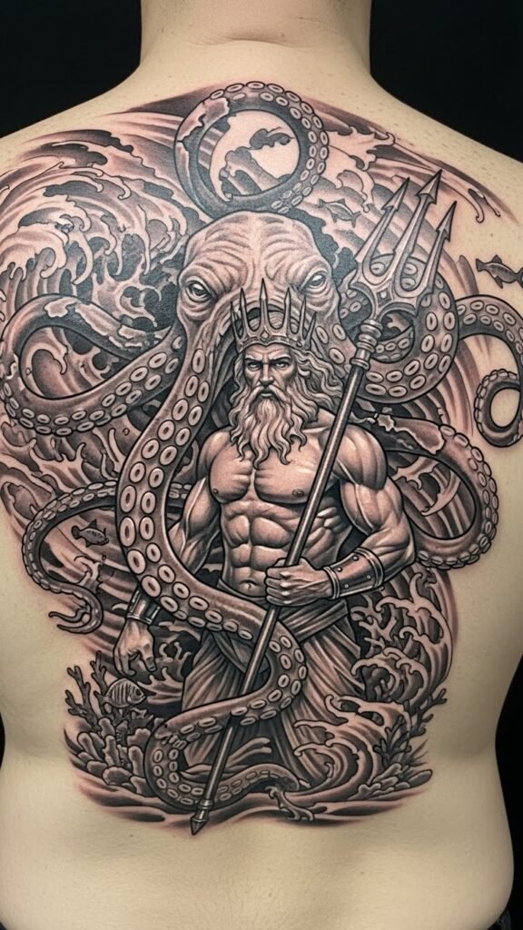 This striking placement on the shoulder blade symbolizes strength and resilience, embodying the wearer’s connection to the mysterious depths of the ocean.