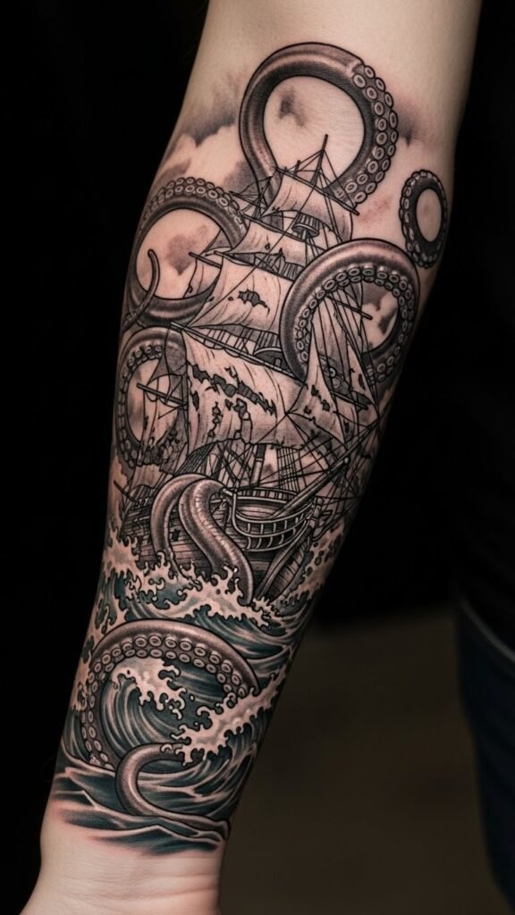Placed on the forearm, it serves as a constant reminder of the mysteries that lie beneath the surface, encouraging the bearer to embrace their own power and navigate life’s challenges with courage, much like the legendary kraken navigating the turbulent seas.