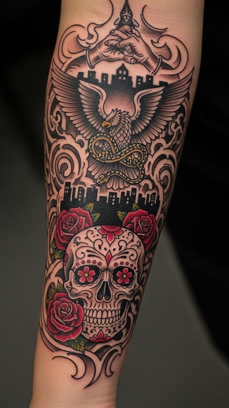 This tattoo design symbolizes resilience and beauty, reflecting the rich cultural heritage of Los Angeles. Roses often represent love and passion, while the Chicano art style connects deeply with personal history and identity. Positioned on the forearm, it serves as a visible reminder of one’s roots and the stories that shape us, inviting conversation and connection with others.