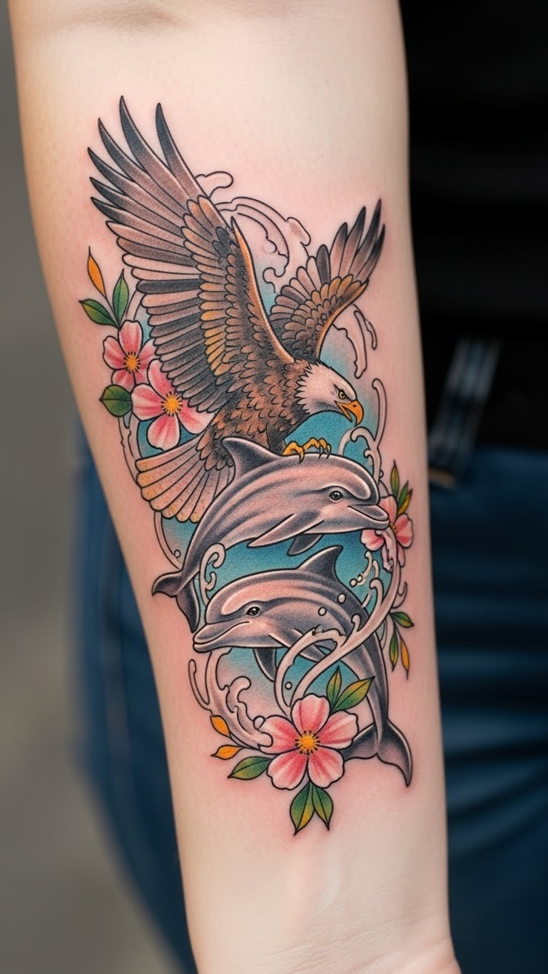 The placement on the forearm allows for visibility, making it a constant reminder of one’s love for the environment. The soaring eagle represents strength and perspective, while the playful dolphins embody joy and playfulness.