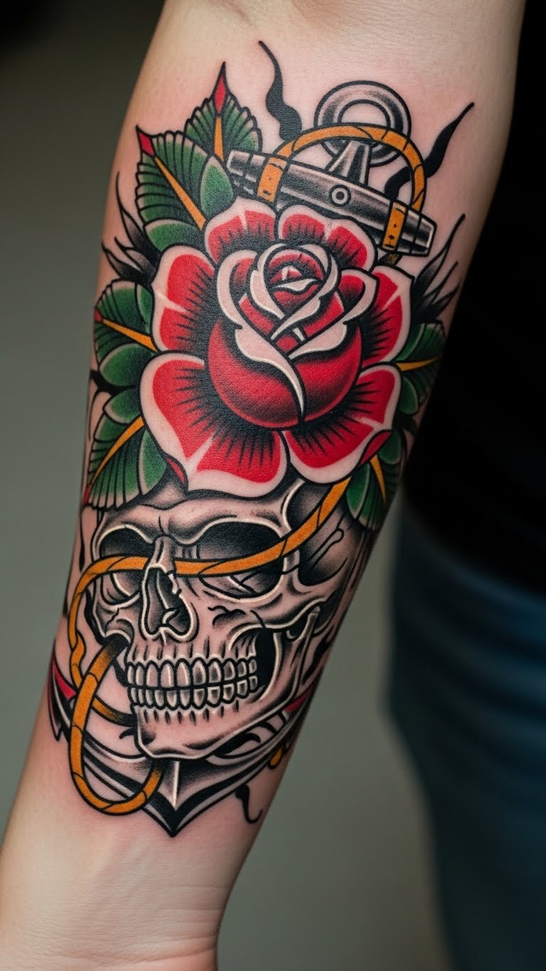 This tattoo design symbolizes the duality of life and death, represented by the rose and skull, while the anchor signifies stability and hope amidst tumultuous times.