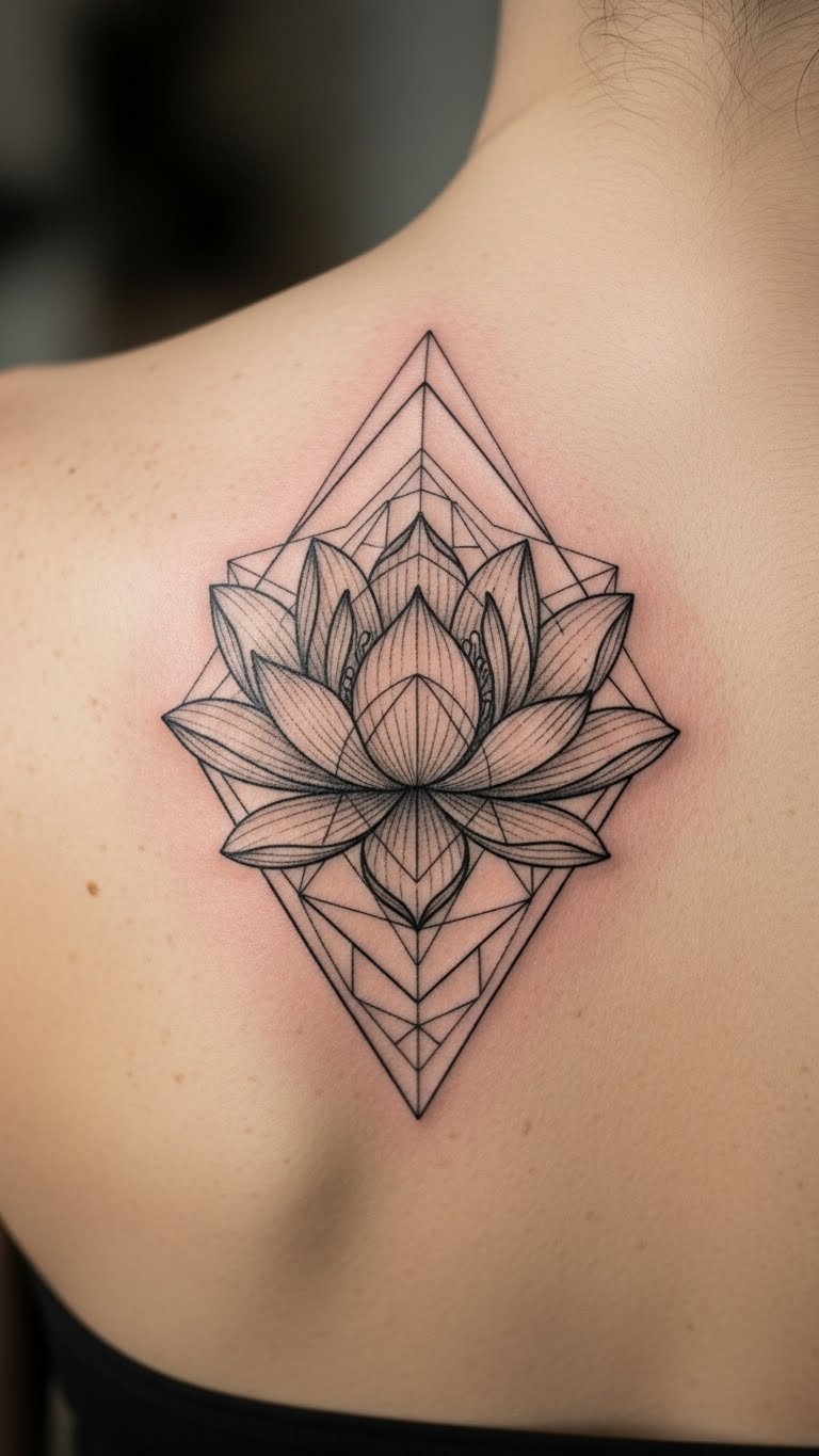 The geometric patterns surrounding it represent harmony and balance in life. Positioned on the upper back, this tattoo serves as a reminder of one’s journey and strength, visible yet intimate, embodying both artistic expression and personal significance.