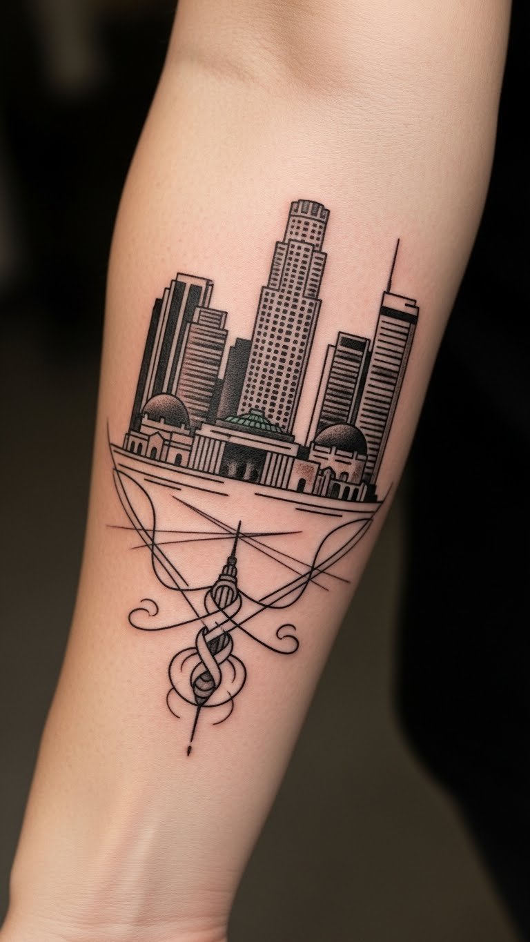 The skyline not only tells a story of urban landscapes but also symbolizes the journey and aspirations of the wearer, making it a deeply personal piece of art.