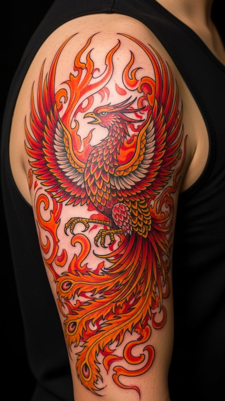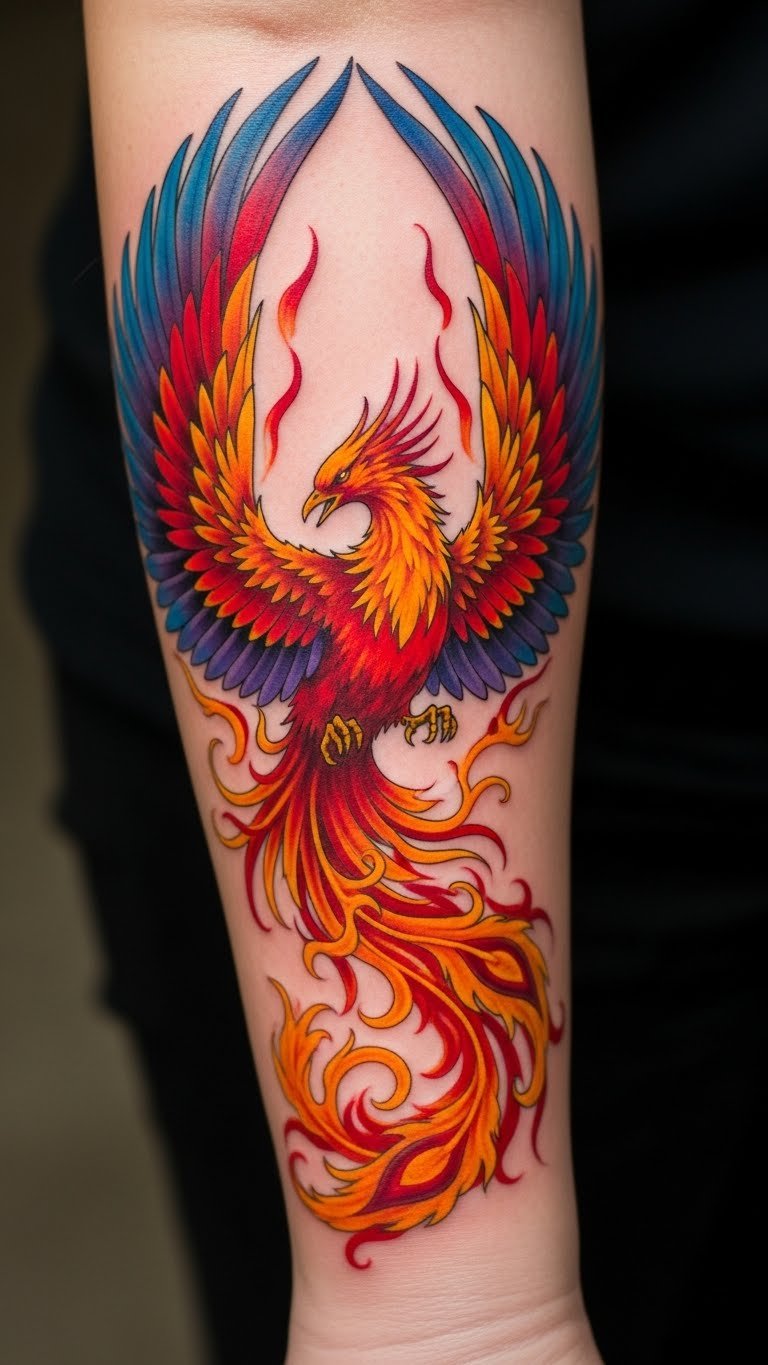 This phoenix tattoo symbolizes rebirth, resilience, and the ability to rise from adversity, reflecting the wearer’s journey and personal growth.