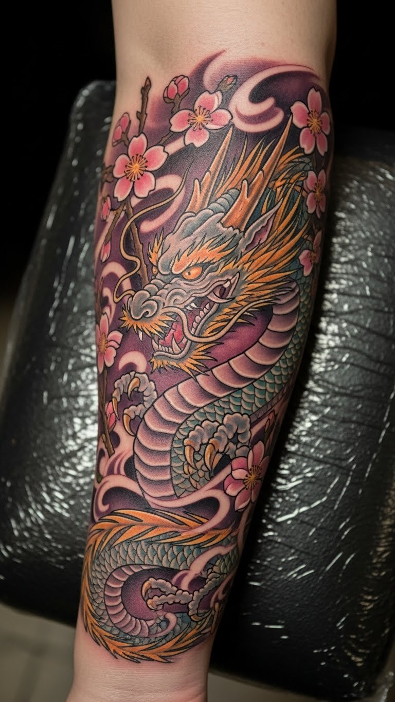 This tattoo symbolizes the harmonious blend of strength and beauty, where the dragon represents power and protection while the cherry blossoms embody the fleeting nature of life and beauty.