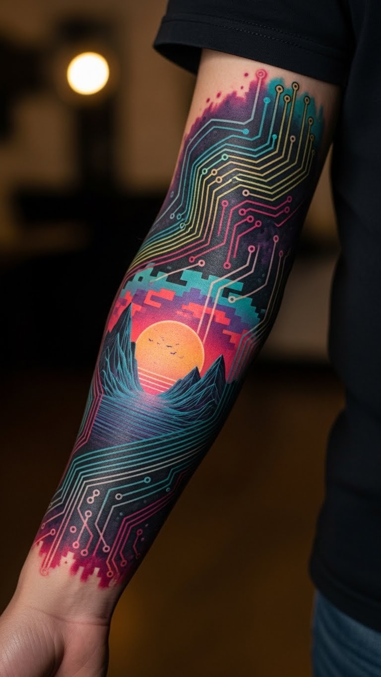 This tattoo on the forearm symbolizes a deep connection to technology and innovation, celebrating the wearer’s embrace of the digital age.