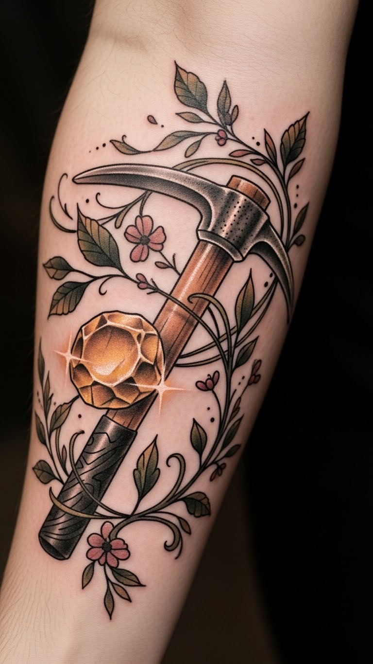 This tattoo design embodies the spirit of adventure and prosperity associated with the Gold Rush era. The pickaxe symbolizes the relentless pursuit of dreams, while the gold nugget represents the rewards of hard work and determination.
