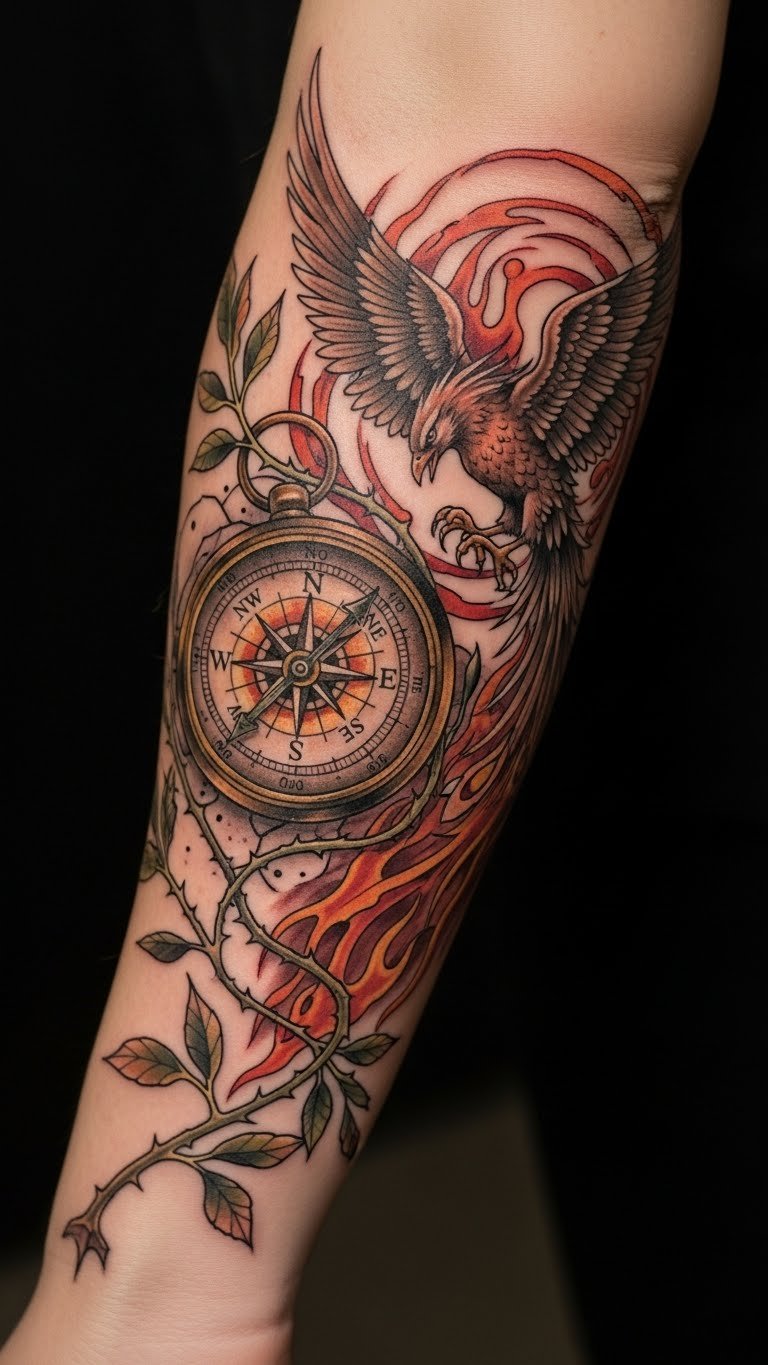 The intertwined vines represent personal growth and connection to one’s heritage, while the phoenix signifies rebirth and transformation.