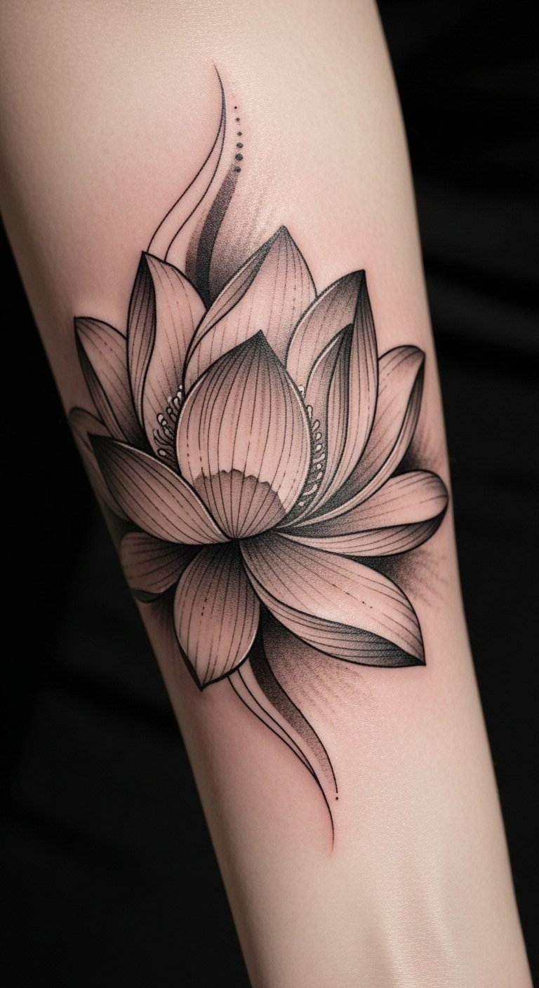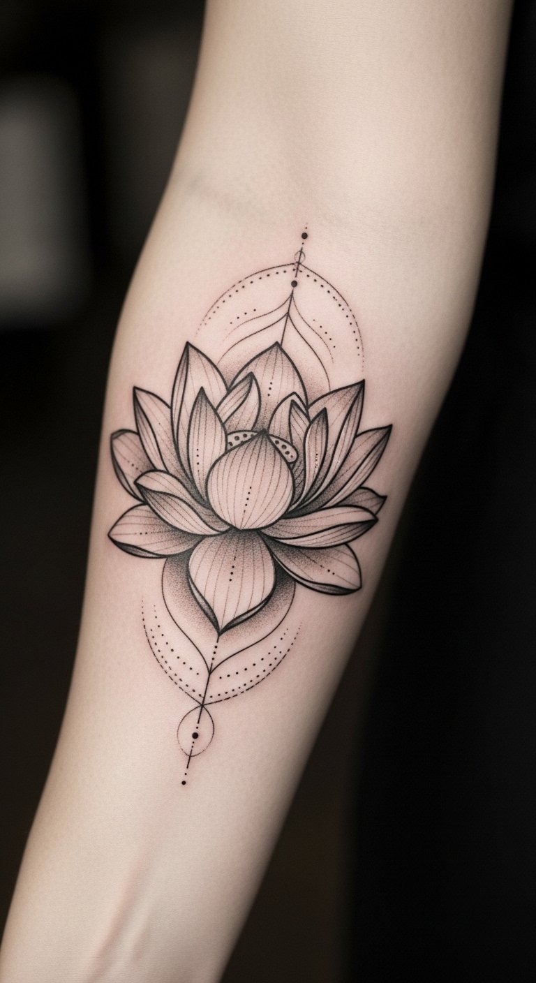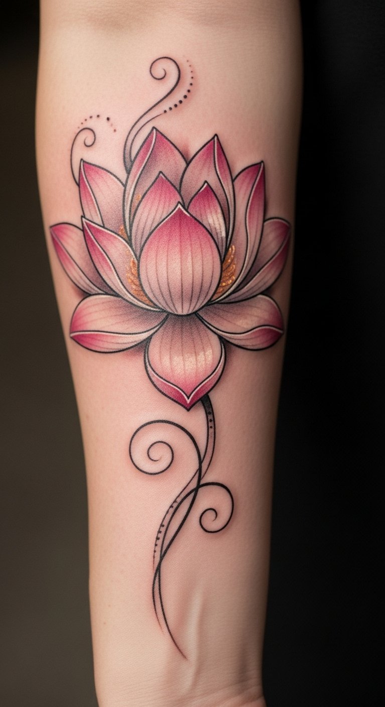 The lotus tattoo on the forearm symbolizes purity and spiritual awakening, making it a powerful reminder of personal growth.