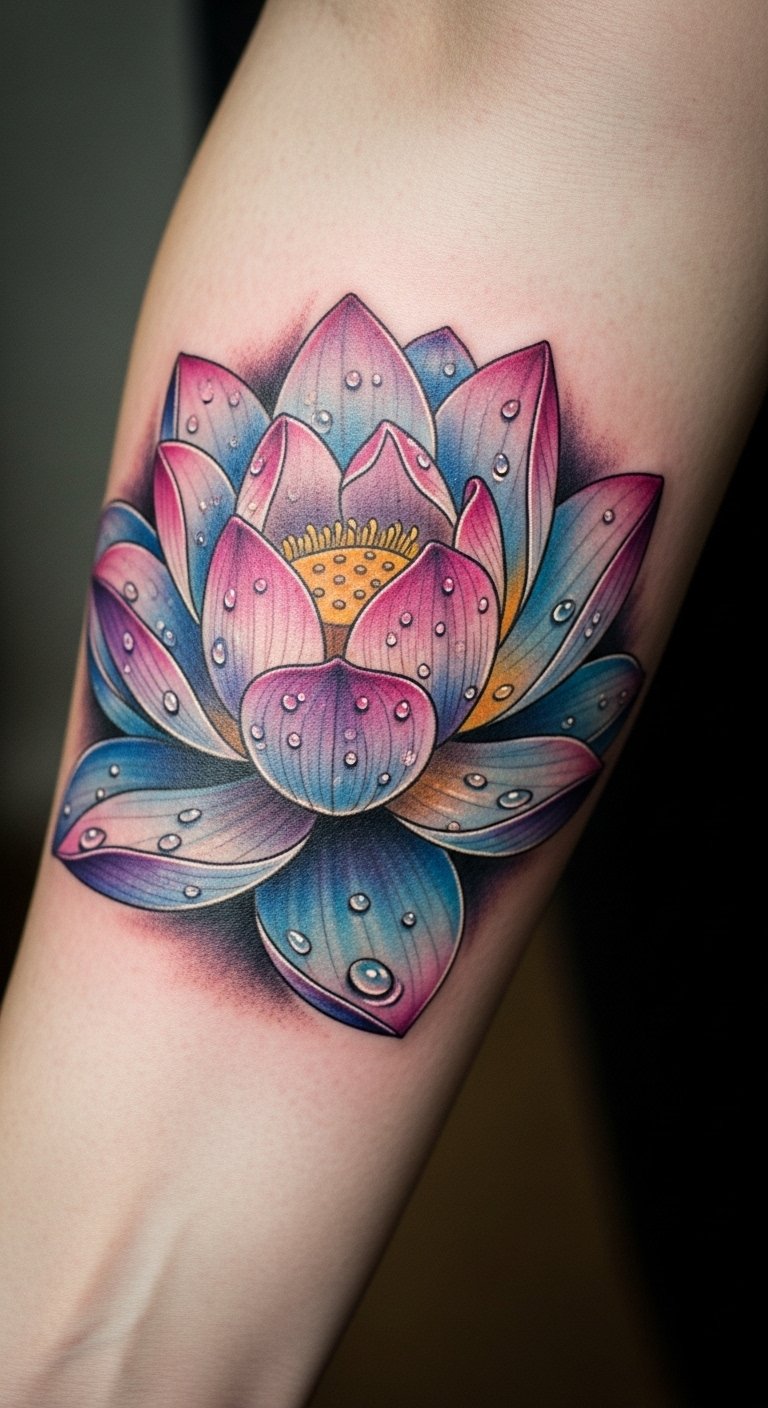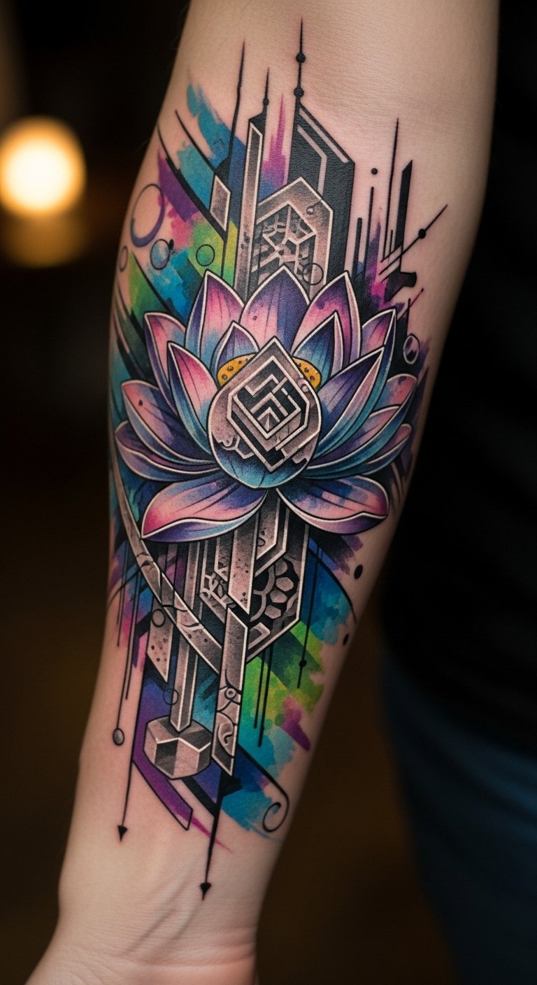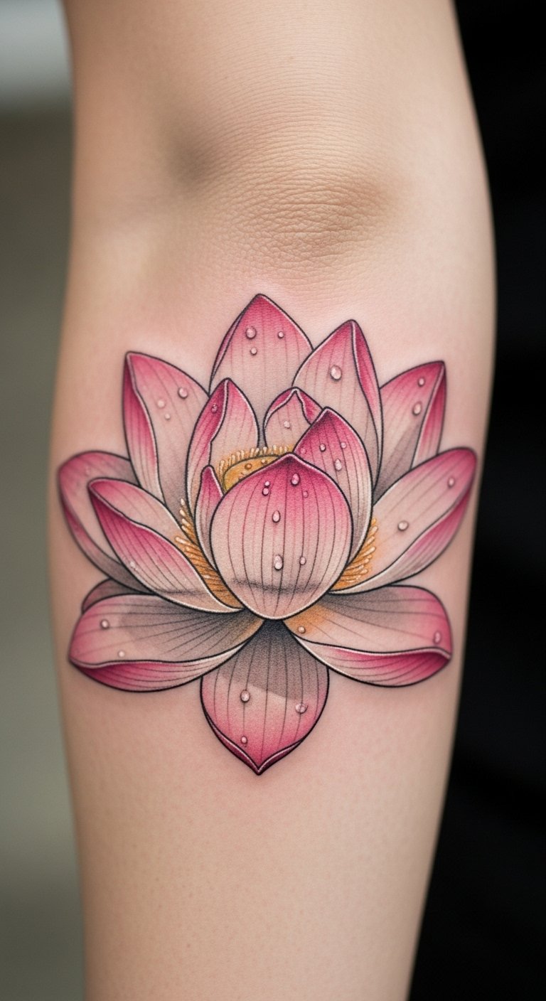 The lotus tattoo on the forearm symbolizes purity and spiritual awakening, making it a powerful reminder of personal growth.