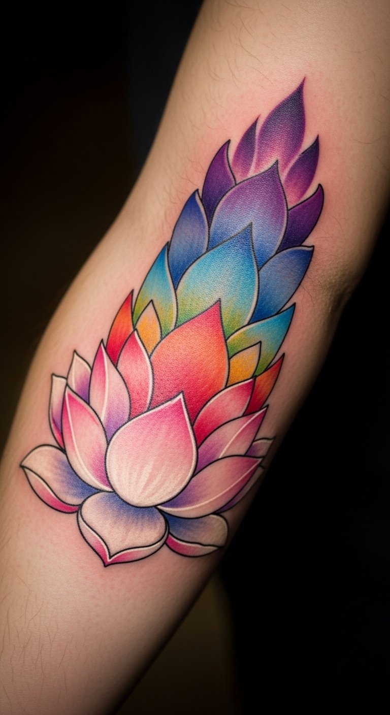 The lotus tattoo’s colors weave a tapestry of profound meanings, resonating deeply with personal growth and spiritual aspirations.