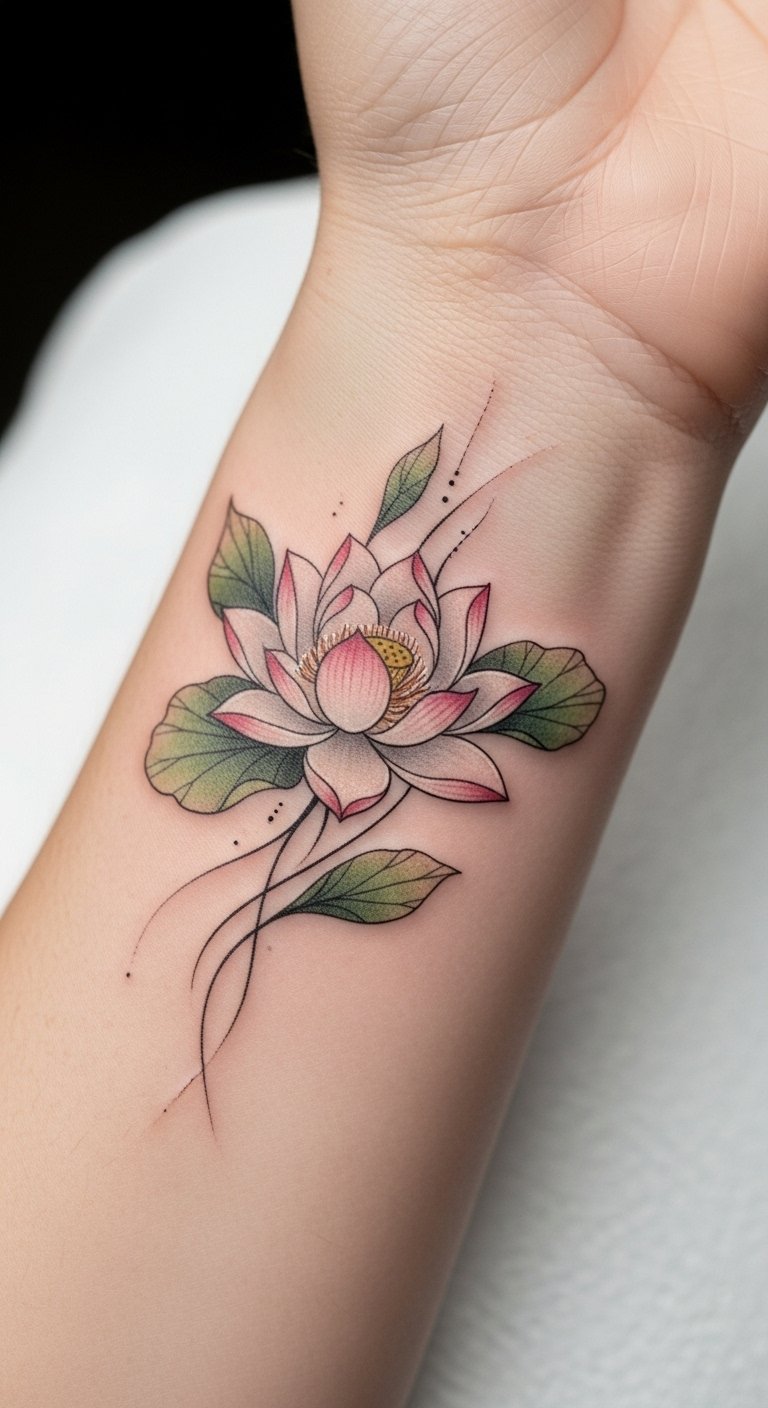 The soft lotus tattoo on the wrist symbolizes personal growth and resilience, embodying the journey toward balance and inner peace.