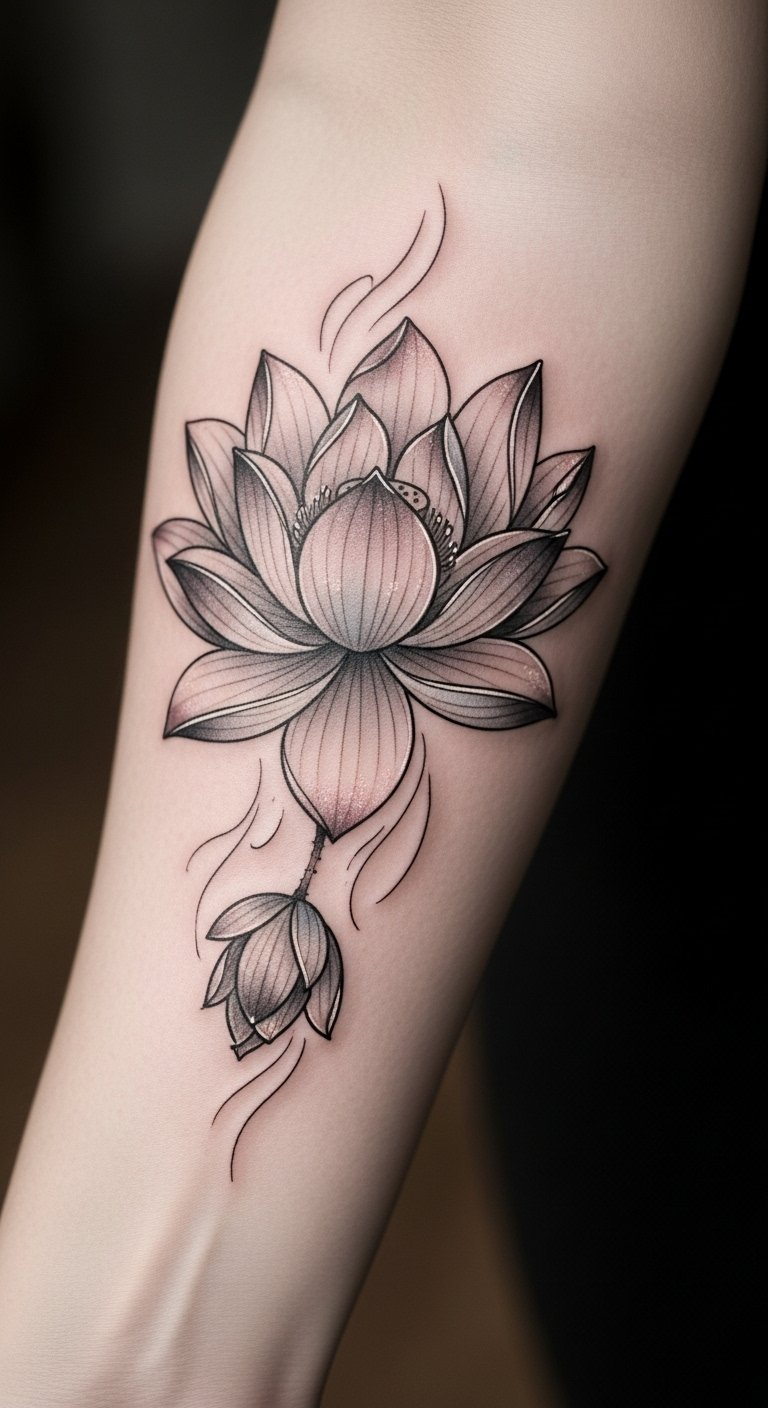 The lotus tattoo on the forearm symbolizes purity, beauty, and spiritual growth, resonating deeply with the wearer’s personal journey.