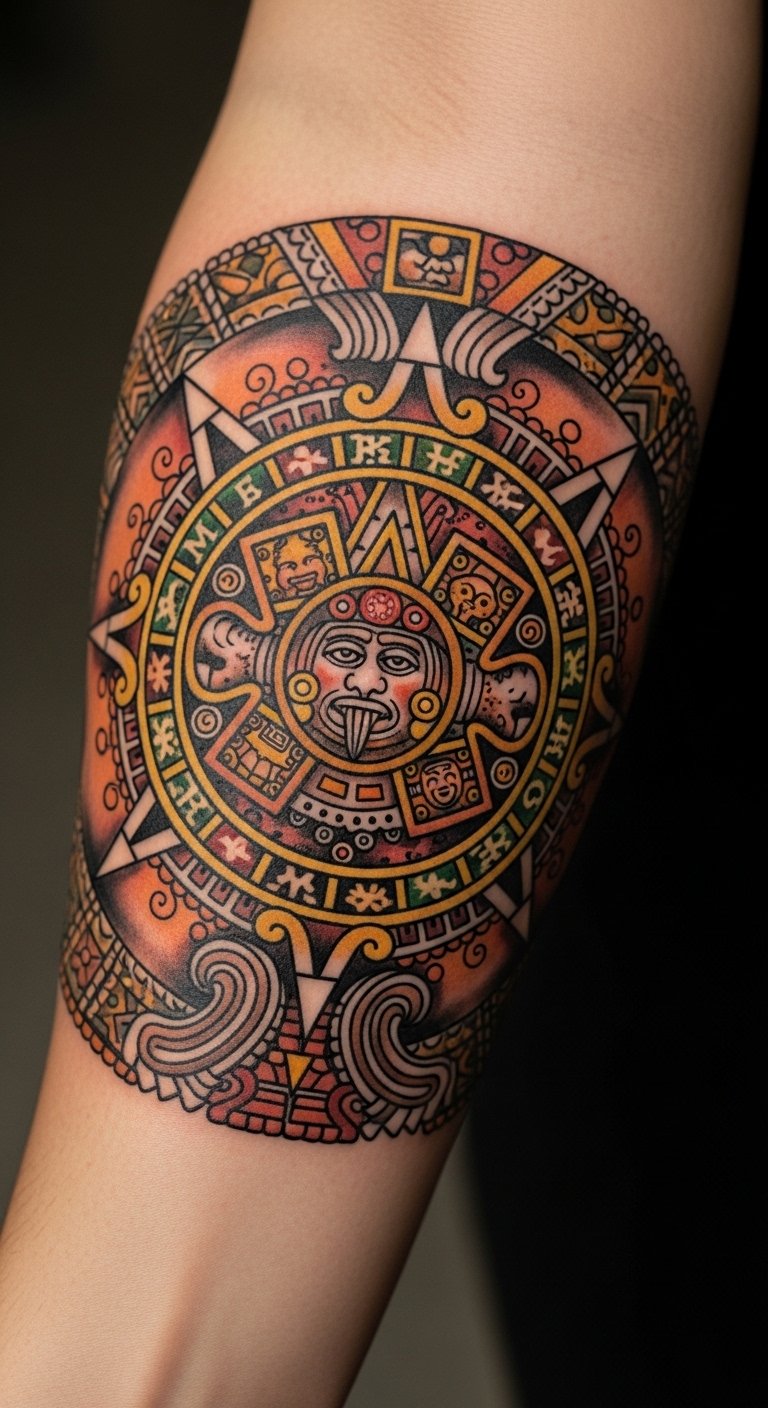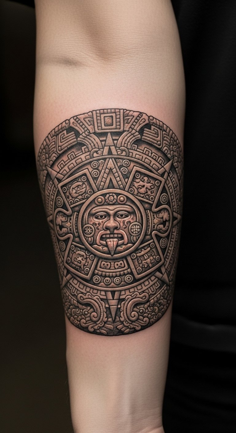 The Aztec Sun Stone tattoo on the forearm serves as a powerful reminder of life’s cycles and cosmic connections. Its intricate design symbolizes the harmony between creation and unity, resonating with the wearer’s personal journey.
