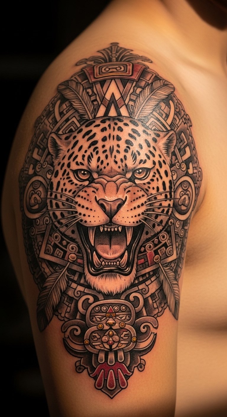 This tattoo symbolizes the strength and valor of the Jaguar Warriors, embodying the fierce spirit of bravery within Aztec culture.