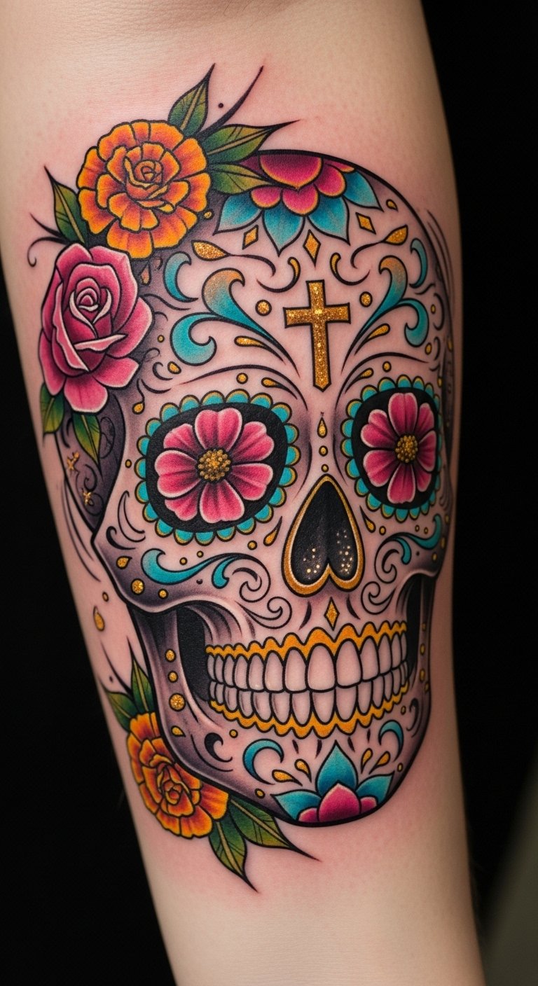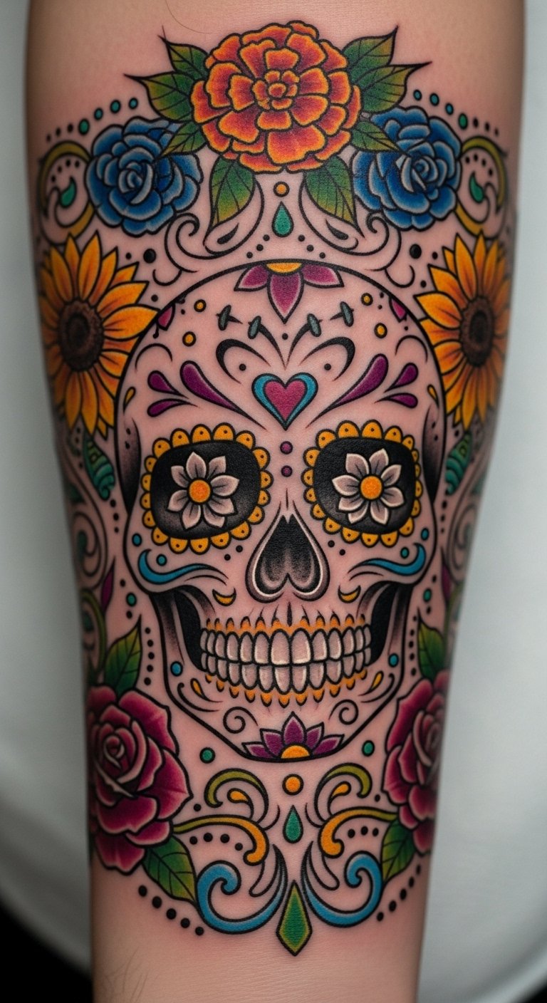 This tattoo symbolizes the celebration of life and death, merging traditional Mexican artistry with personal identity.
