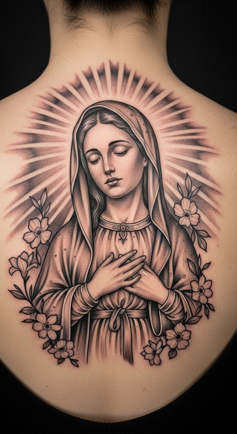This tattoo symbolizes a deep connection to faith and maternal love, embodying the protective nature of the Virgin Mary.