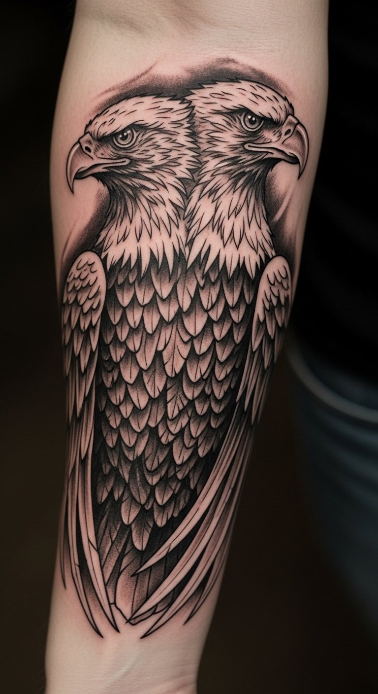 This tattoo design captures the powerful symbolism of the double-headed eagle, representing strength and duality.