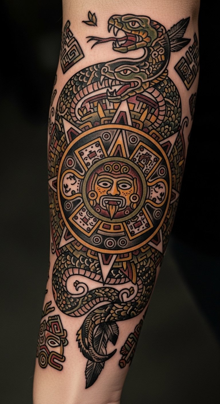 This tattoo embodies the connection to ancient Aztec spirituality, with the serpent symbolizing transformation and rebirth, while the solar disc represents life and energy.