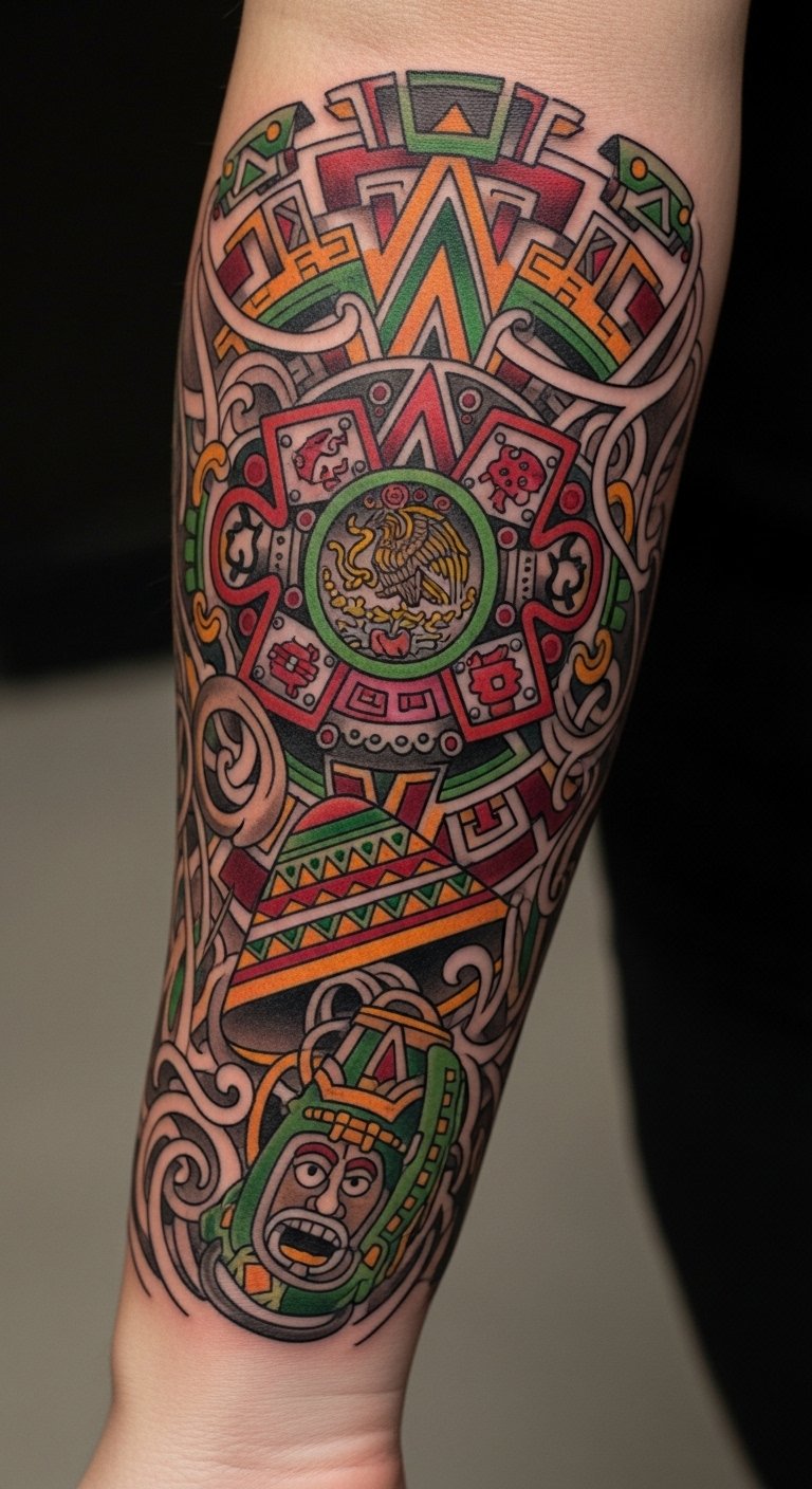 The tattoo of Huitzilopochtli on the forearm symbolizes strength, resilience, and the indomitable spirit of the warrior.