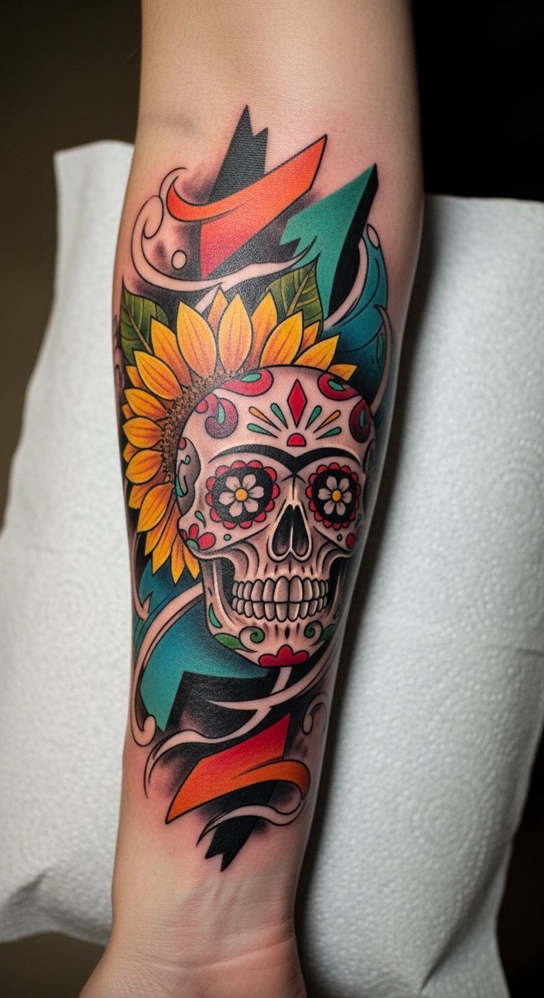 This sugar skull tattoo on the forearm symbolizes the joyous remembrance of loved ones during Día de los Muertos, blending beauty with the celebration of life’s fleeting moments.