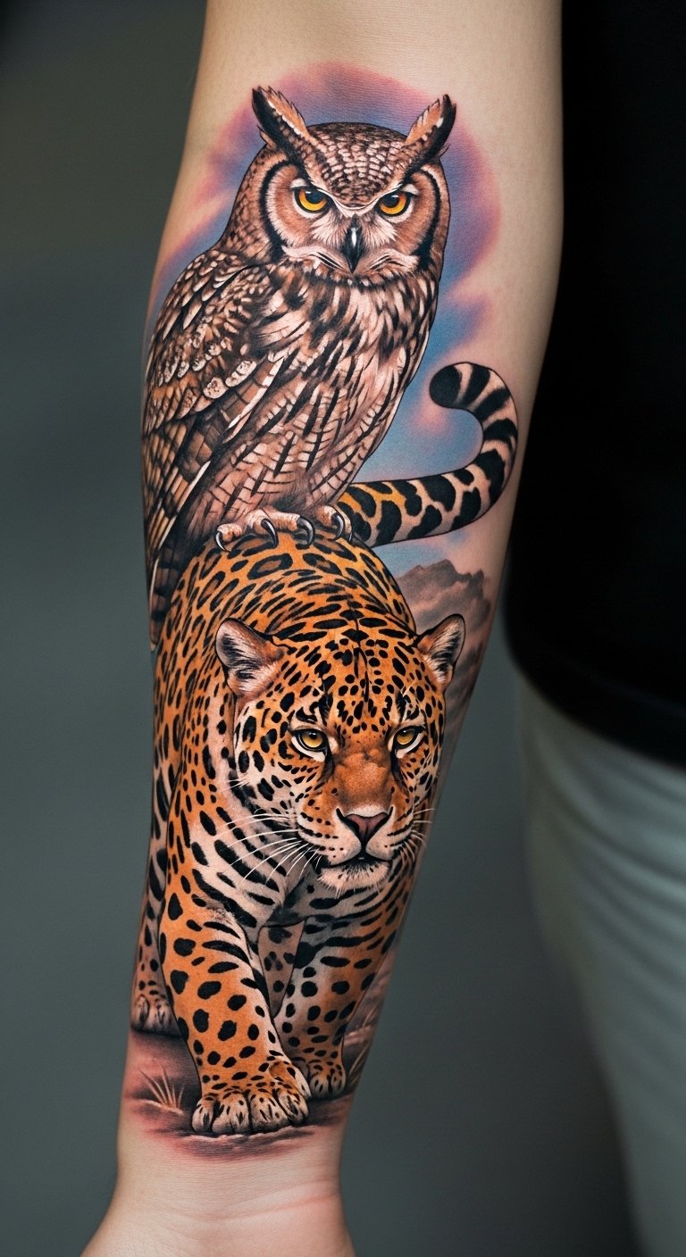 The jaguar and owl tattoo represents a powerful duality of strength and wisdom, inviting the wearer to embrace their inner qualities.