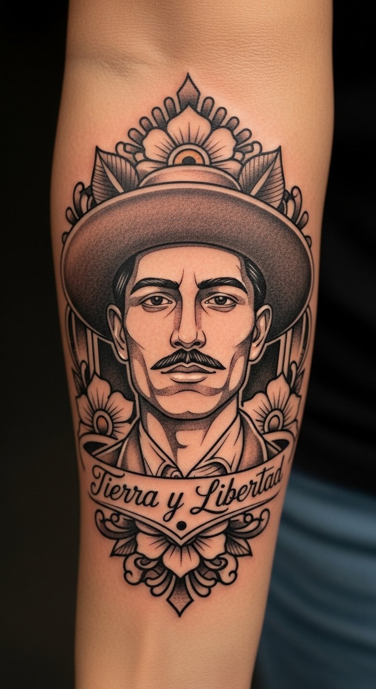 This tattoo serves as a powerful tribute to Emiliano Zapata, symbolizing the fight for land and freedom.