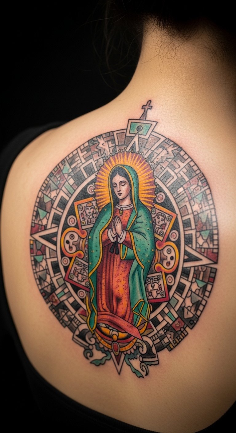 The combination of the Virgin Mary with Aztec elements reflects a fusion of faith and identity, inviting admiration and contemplation.