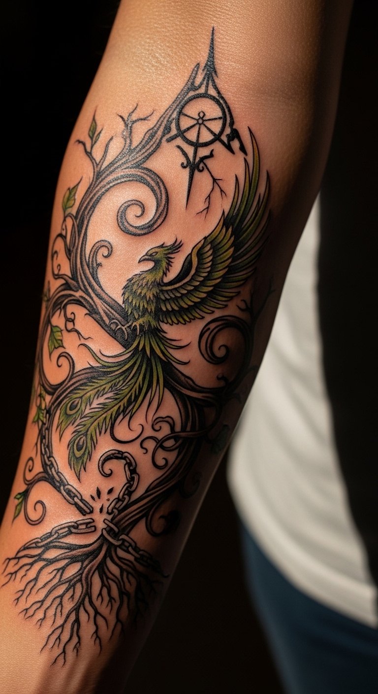 This tattoo symbolizes the strength and defiance of the wearer, with the phoenix representing rebirth and resilience, while the broken chain signifies freedom from oppression.