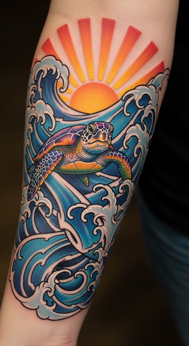 The sea turtle represents resilience and longevity, while the sunburst signifies hope and new beginnings.