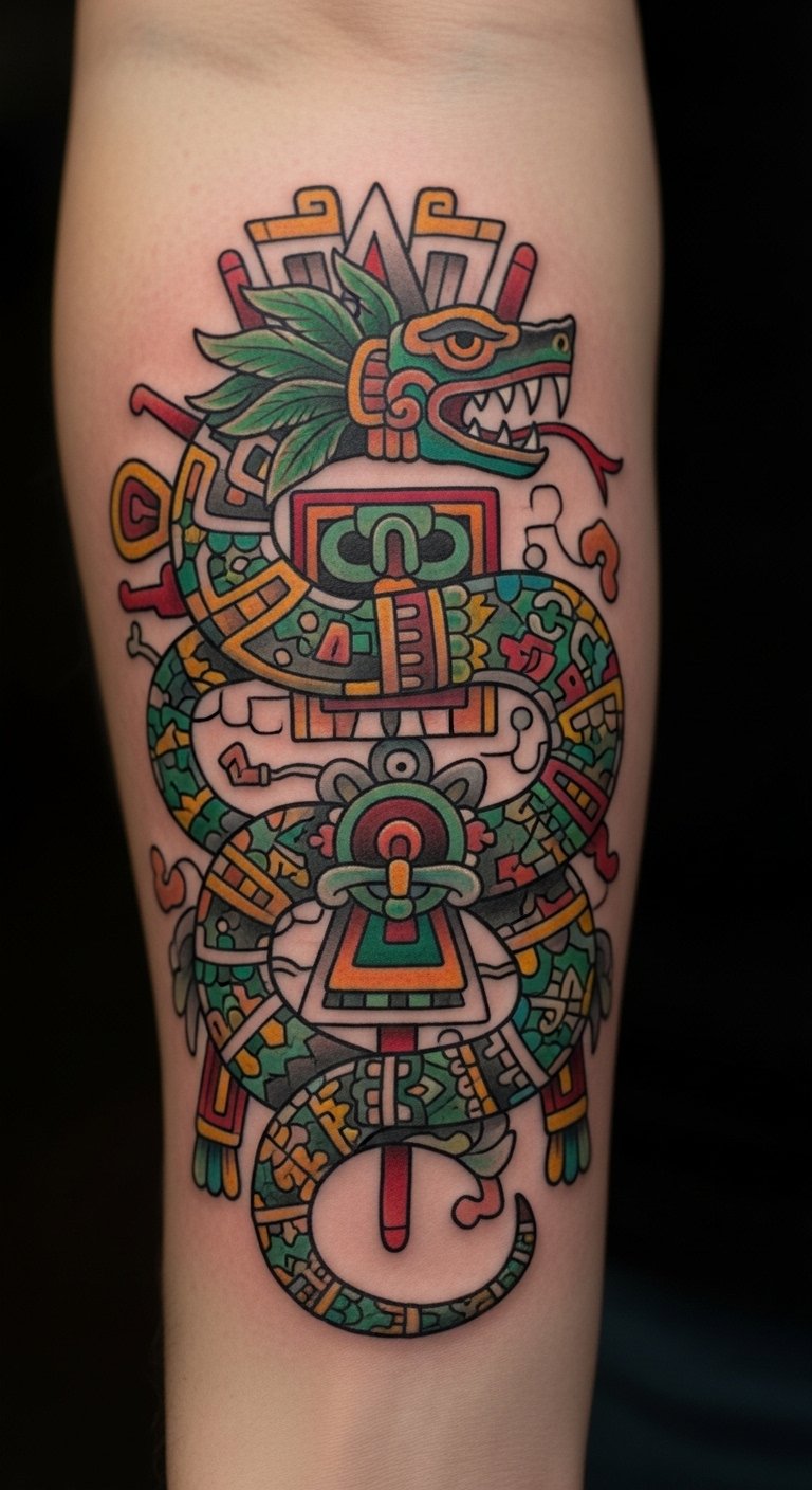 This tattoo represents a deep connection to Mesoamerican mythology, embodying wisdom and renewal.
