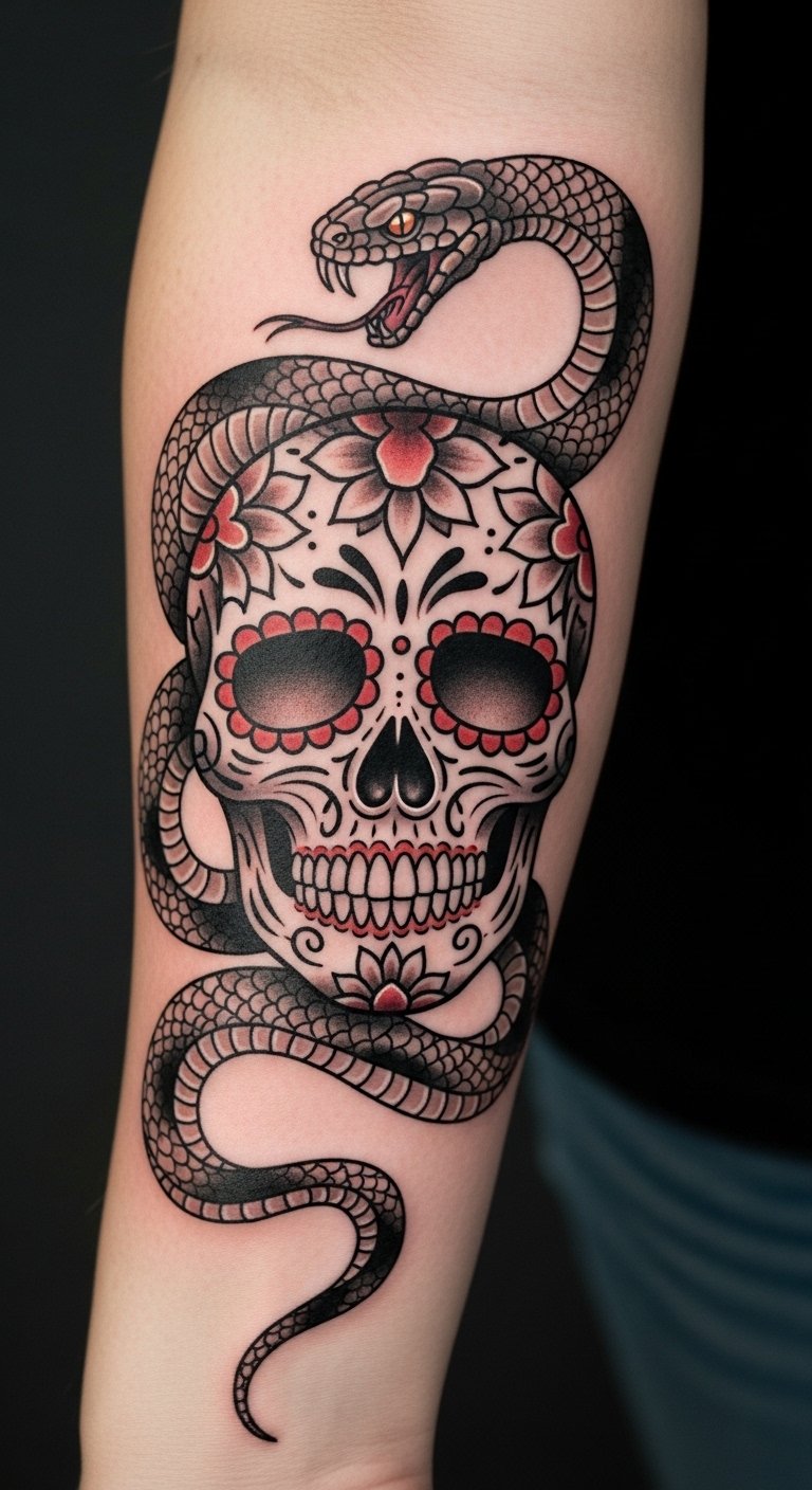 This tattoo beautifully marries traditional Mexican motifs with contemporary artistry, symbolizing the duality of life and death through the calavera and the transformative nature of the serpent.