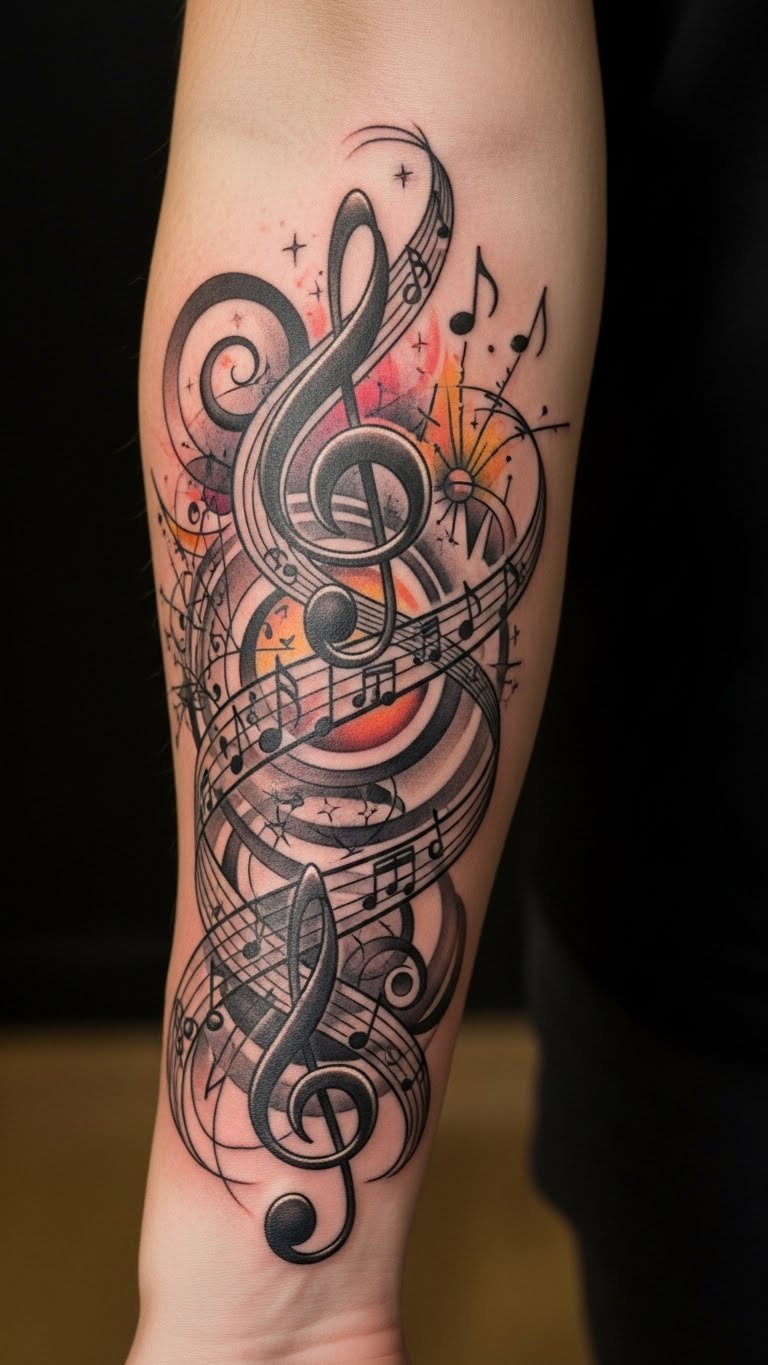 This tattoo embodies musical symbolism, representing aspiration and creativity.