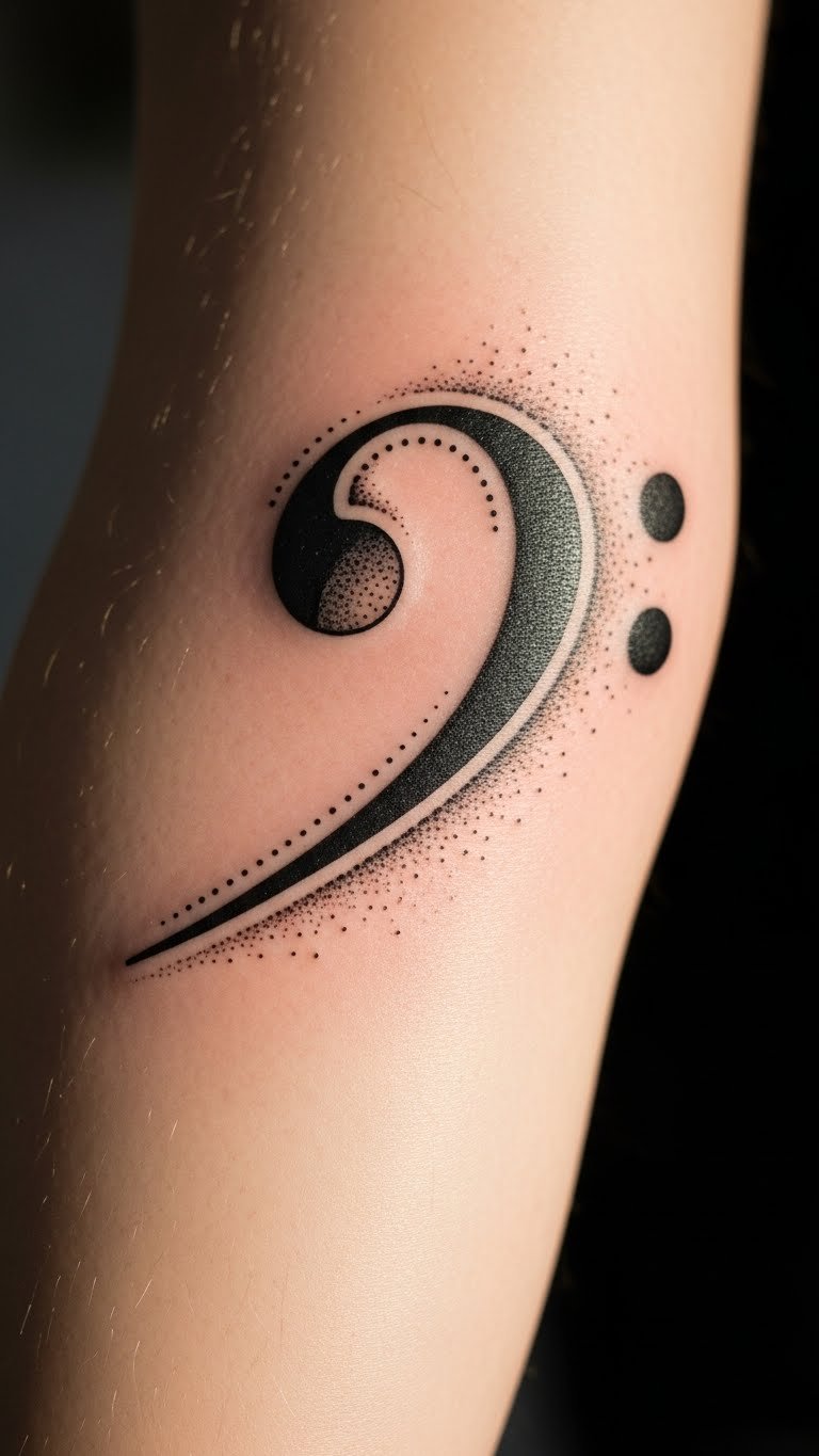 The elegant curves of the bass clef symbolize depth and richness, inviting admiration and sparking conversations about the wearer’s connection to music, artistry, and the vibrant experiences that shape their identity.