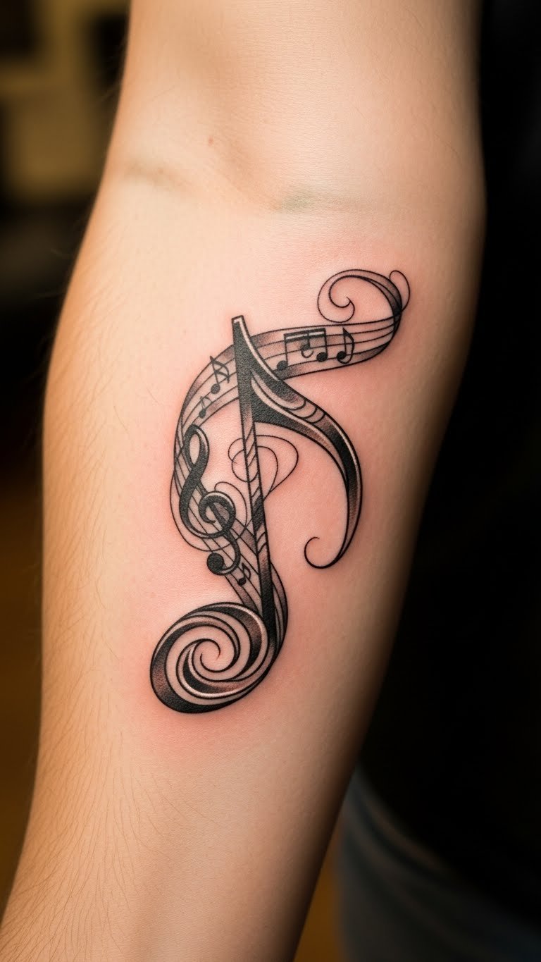 This tattoo embodies the spirit of music through its fluid design, symbolizing the harmony and rhythm that resonate within us.