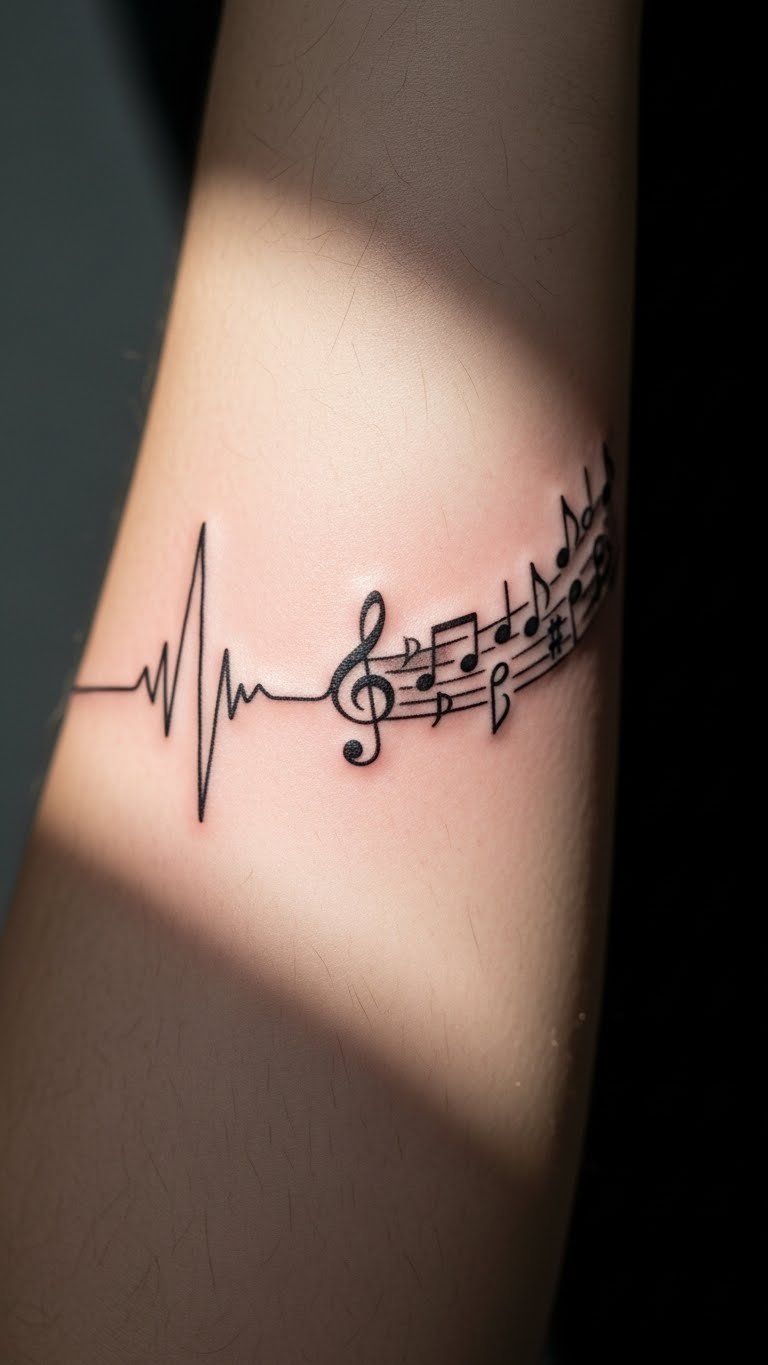 This tattoo symbolizes the deep connection between one’s heartbeat and the rhythm of music, representing passion and emotional expression.