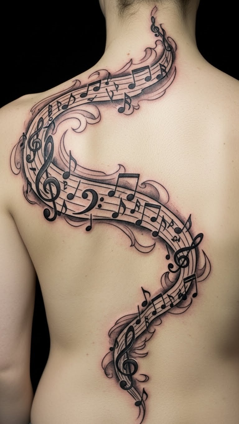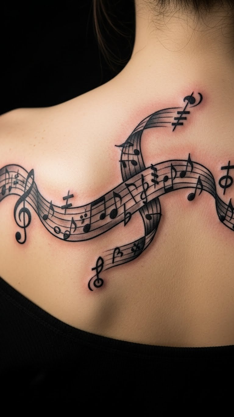This tattoo design, placed on the upper back, symbolizes the journey of life through music. The flowing notes represent the rhythm of personal experiences, while the unique symbols reflect cherished memories and influences.